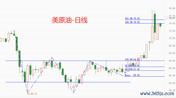 走势结构角度看,日线级别,美原油处于中短期多头趋势之中,近期波动率显著加大。最近三个交易日K线的上下限,处于上周五单根K线的顶底价格之间,意味着多头力量仅在上周五出现爆发,之后便与空头力量不相上下。最新市价72.79美元,处于前一轮波段的3.382~3.618分位之间,面临强阻力区间的压制。预计美原油还将在74~75美元之间震荡一段时间,直至消息面传来利多消息,才能够上破80美元关口。