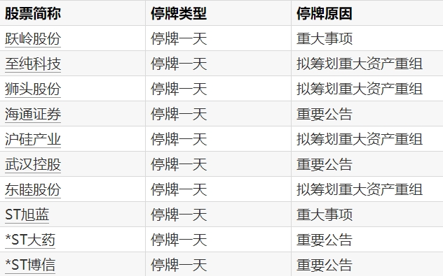 A股停牌提示:10股今日停牌A股停牌提示:10股今日停牌